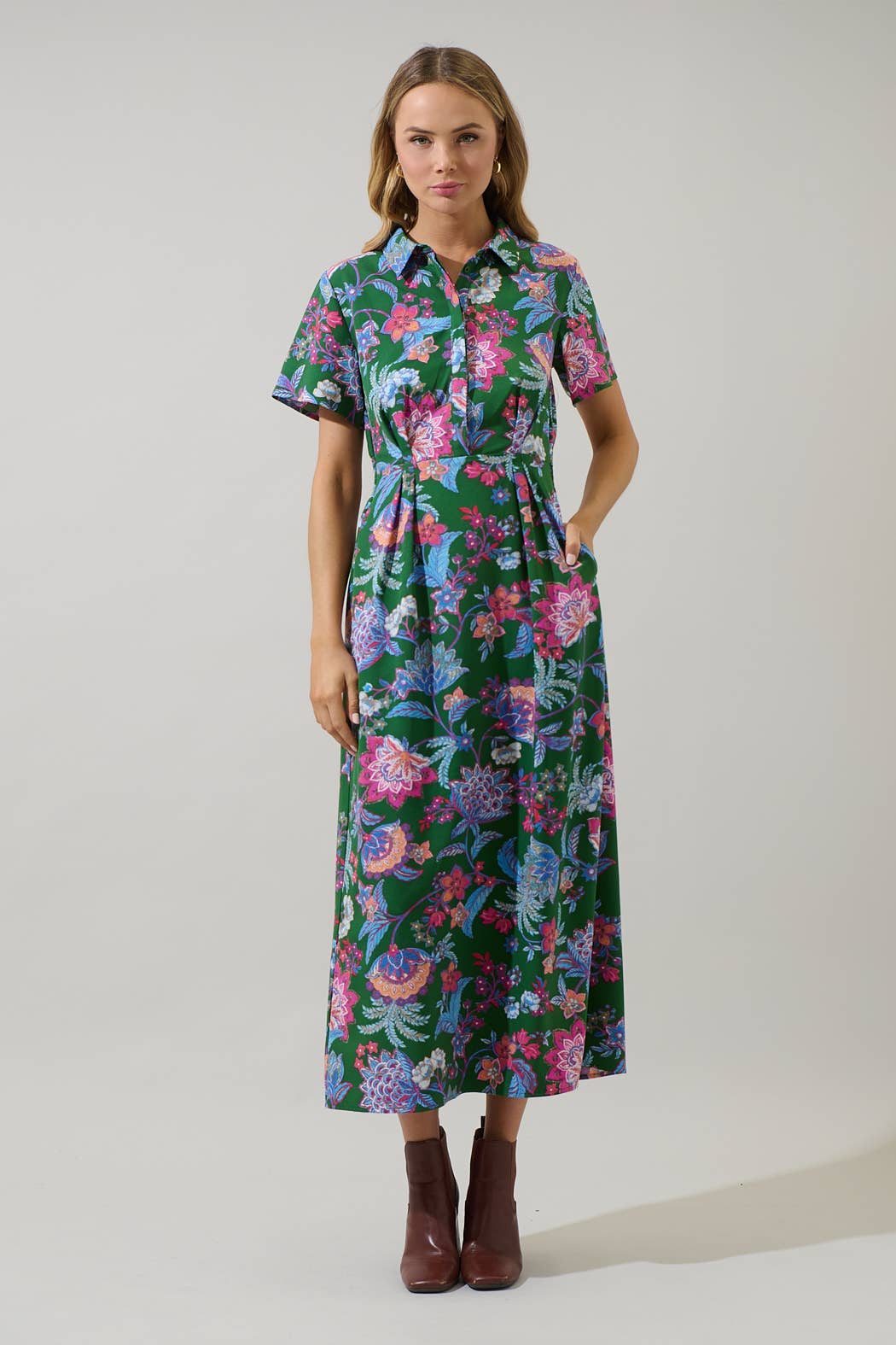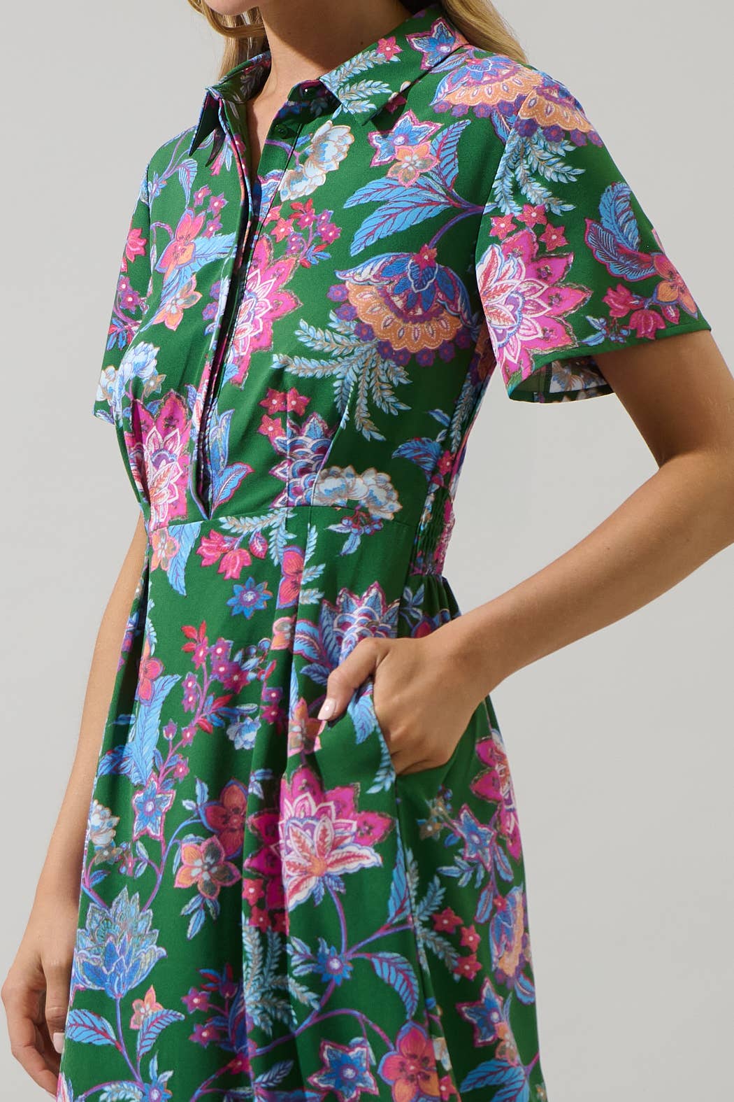 Freshen up your wardrobe with this effortlessly charming dress. Designed with a floral print, it features a collared neckline, button-down front, half sleeves, waist smocking for a flattering fit, and pleated detailing. Style it with espadrille wedges and a woven tote for an easy, polished look.