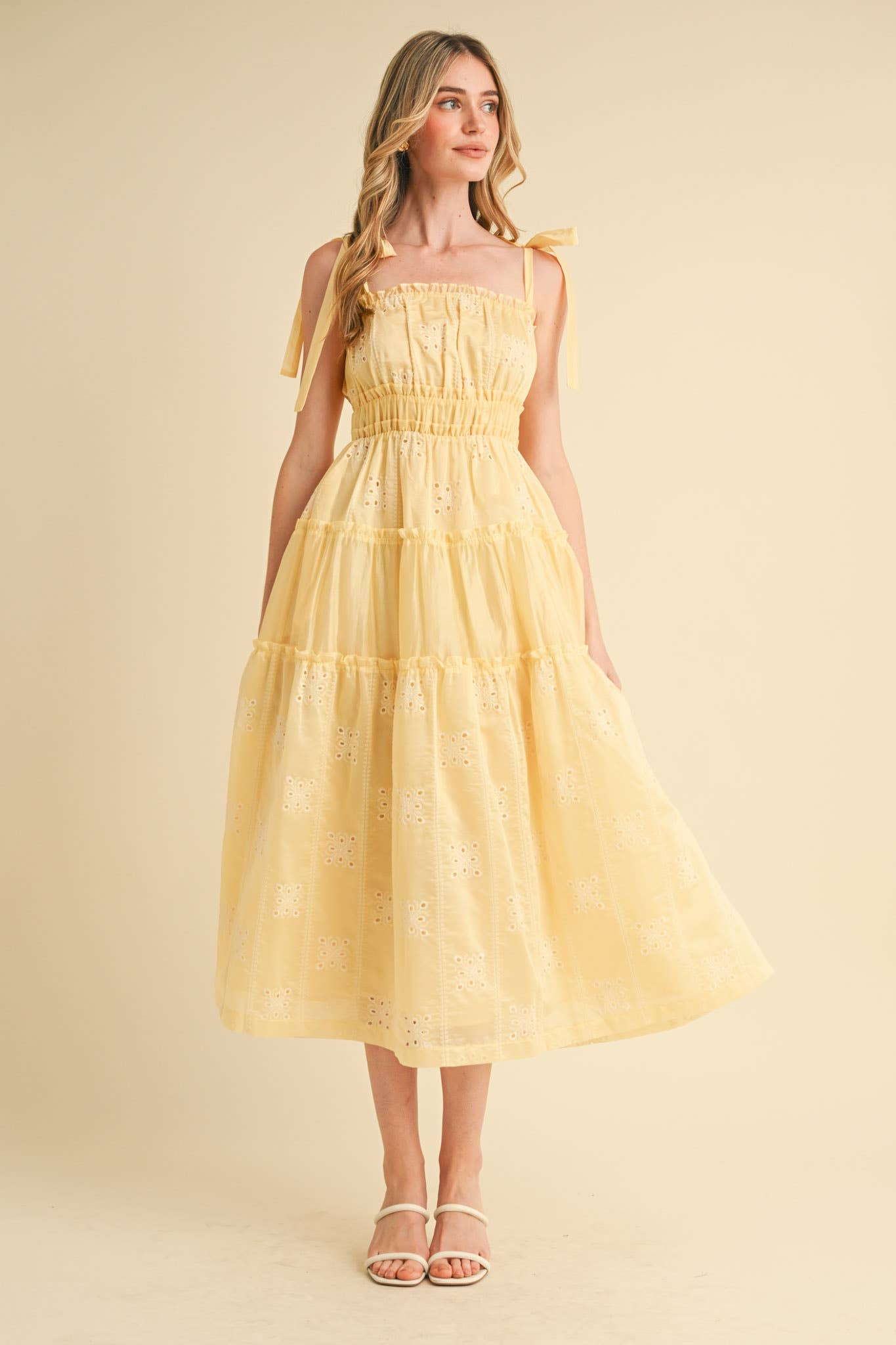 We're loving the breezy vibes of this tiered eyelet midi dress! Lightweight fabric shapes a tie strap dress that support a ruffled neckline with a flirty ruffled elastic waist. Ruffle trimmed tiers fall into a flowy midi skirt, accented with contrast pierced eyelet fabric. Pair with a wide brimmed hat for the ultimate vacay look!
